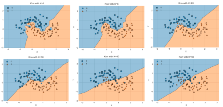 만약 k=1로 설정한다면 1개의 데이터만 의존하여 잡음이 생기며, 과다적합이 발생할 수 있다. 그렇다고 k를 많이 설정한다면 주변 데이터가 아닌, 전체 데이터로 추정하는 것이기 때문에 올바르지 않다. 따라서 여러 번 테스트해보고 적절한 k를 찾는 것이 중요하다. 또한 거리를 측정할 때에도 다양한 거리측정자가 있는데, 각각 거리측정자를 테스트하고 성능이 좋은 것을 선택한다.