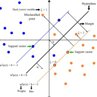 이러한 서포트 벡터 머신은 선형분류기 이기 때문에, 비선형 데이터의 분류 문제를 대응하기 위해 오분류를 허용하는 슬랙변수(slack variable)를 활용할 수 있다. 슬랙변수는 잘못 분류된 데이터로부터 해당 클래스의 결정 경계까지의 거리를 의미한다.