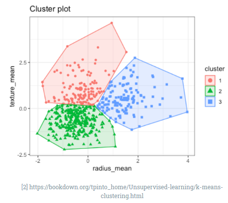 평균값을 이용하여 주어진 데이터 집합을 K개의 그룹으로 묶는 방법이다. 데이터 집합 중 임의로 K개의 벡터를 선택하여, 초기 대표벡터를 설정한다. 이후 나머지 데이터에 대해 K개의 대표벡터들과의 거리를 계산하여 해당 데이터와 대표벡터가 하나의 클러스터에 속하도록 레이블링한다. 새롭게 생성된 클러스터에 대해 대표 벡터를 다시 갱신하고, 다른 데이터에 대해서도 이 과정을 반복 수행한다. 수정 전의 대표벡터와 수정 후의 대표 벡터의 차이가 없다면 반복을 중단한다.