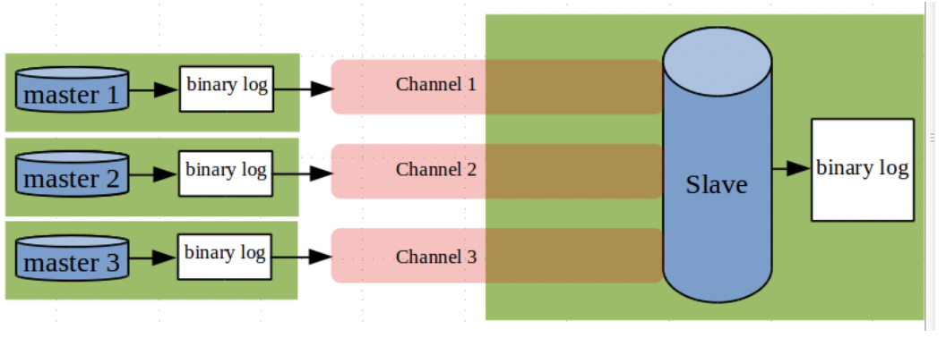 여러 개의 Master DB를 1개의 Slave(Replica) 인스턴스에 연결하여 복제하는 구조로, Master DB를 하나의 Slave(Replica)에 모으는 역할을 한다. 각각의 Master를 Channel을 통해 연결하고, 이 Channel은 Replication 연결에 사용되는 Thread를 관리한다. Master DB란 데이터 원본 서버를 의미하며 데이터의 변경을 담당하고, Slave DB는 백업서버로서 데이터의 읽기 역할을 수행한다.