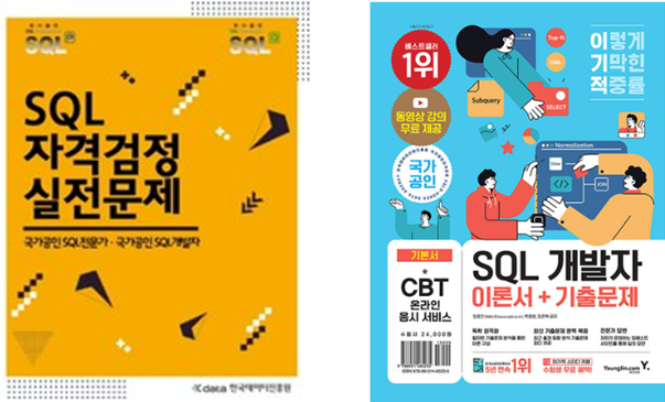 가장 많이 참고하는 SQL 자격검정 실전문제(노랭이)와 이기적 출판사에서 나온 이기적 SQL 개발자+이론서 책 두 가지로 공부해보았다.